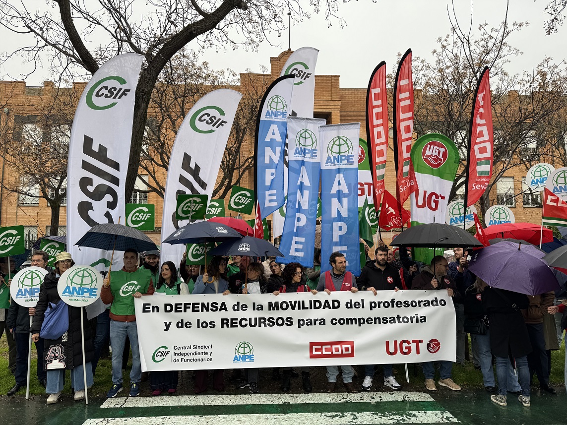 Las organizaciones sindicales  CSIF, ANPE, CCOO y UGT presentes en la Mesa Sectorial de Educación de Andalucía, se han movilizado en el día de hoy  frente a las Delegaciones Territoriales de Desarrollo Educativo y Formación Profesional en las ocho provincias andaluzas  en respuesta al rechazo unánime  al Decreto de Zonas de Transformación Social (ZTS) que la Consejería mantiene en tramitación y que, tal y como está planteado, afecta gravemente a los derechos laborales del profesorado y, además, no garantiza la dotación de recursos que los  centros de compensatoria tienen en la actualidad.