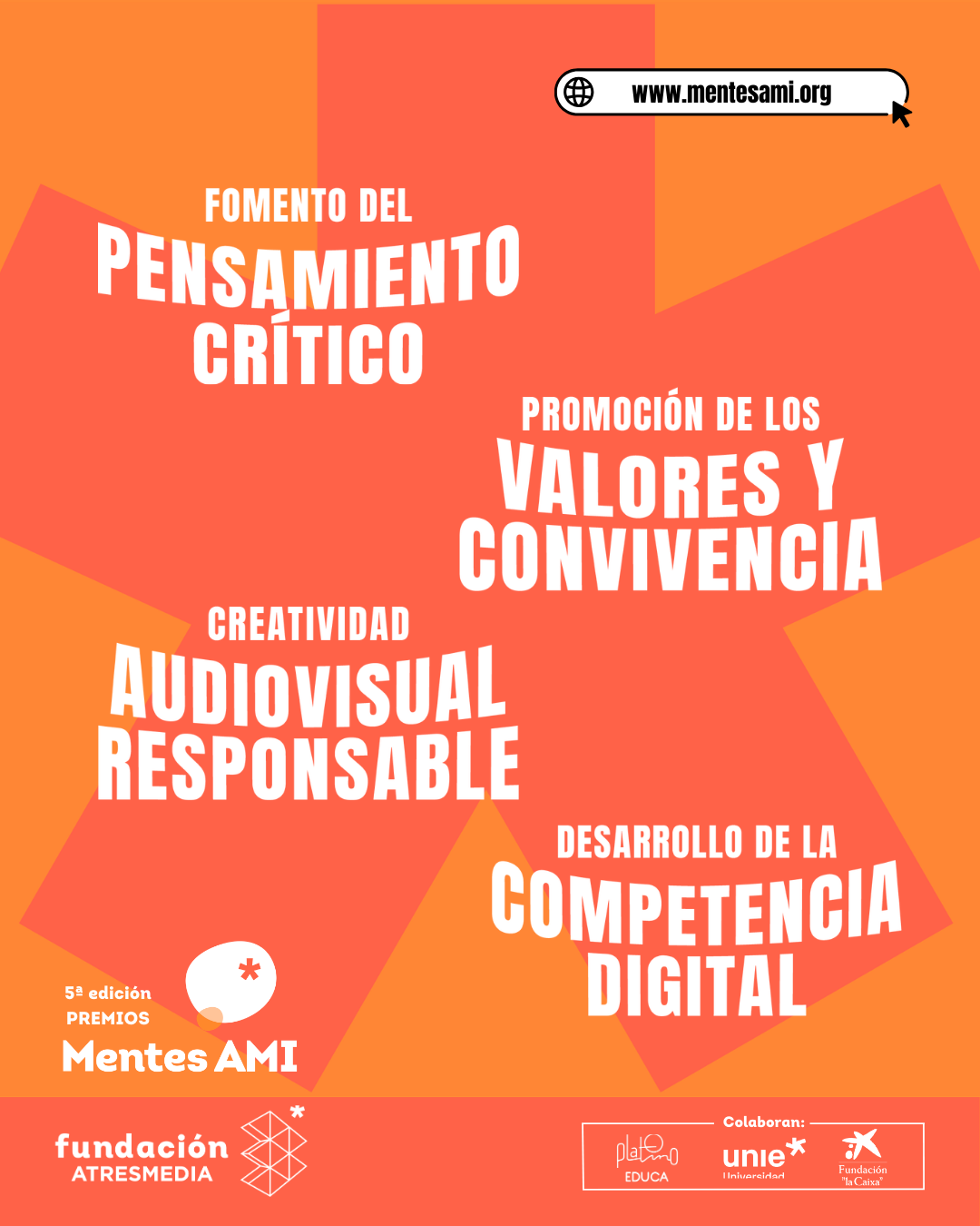 Tras cuatro ediciones reconociendo proyectos educativos referentes en toda España, la Fundación Atresmedia arranca la 5ª edición de los Premios Mentes AMI, una iniciativa que busca promover, premiar y difundir iniciativas que fomentan la alfabetización mediática, informacional y digital en el entorno escolar y que cuenta un año más con la colaboración de Platino Educa, UNIE Universidad y la Fundación ”la Caixa”.