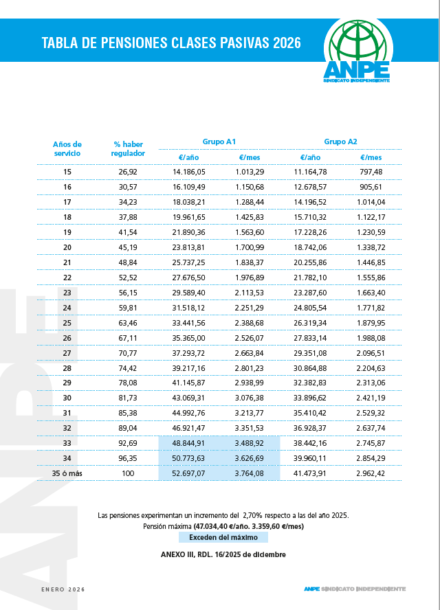 Los funcionarios del grupo A1 con 33 o más años de servicio superan el límite máximo de las Pensiones Públicas, por lo que cobran este límite y no la pensión que les correspondería aplicando al haber regulador el porcentaje por tiempo de servicio.